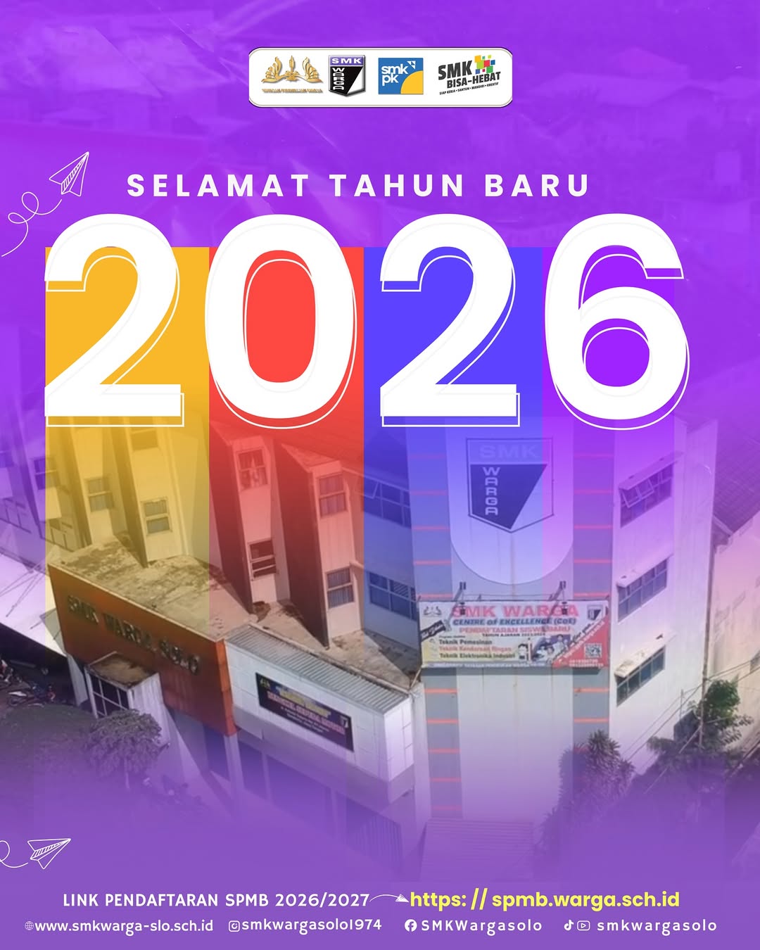 Selamat Tahun Baru 2026 🎉 SMK Warga Surakarta menyambut tahun baru dengan semangat baru, tekad yang lebih kuat, dan harapan untuk terus berprestasi. Semoga di tahun ini seluruh warga sekolah diberikan kesehatan, kelancaran dalam belajar dan berkarya, serta kesuksesan dalam meraih cita-cita. Bersama kita melangkah maju menuju masa depan yang lebih gemilang ✨
